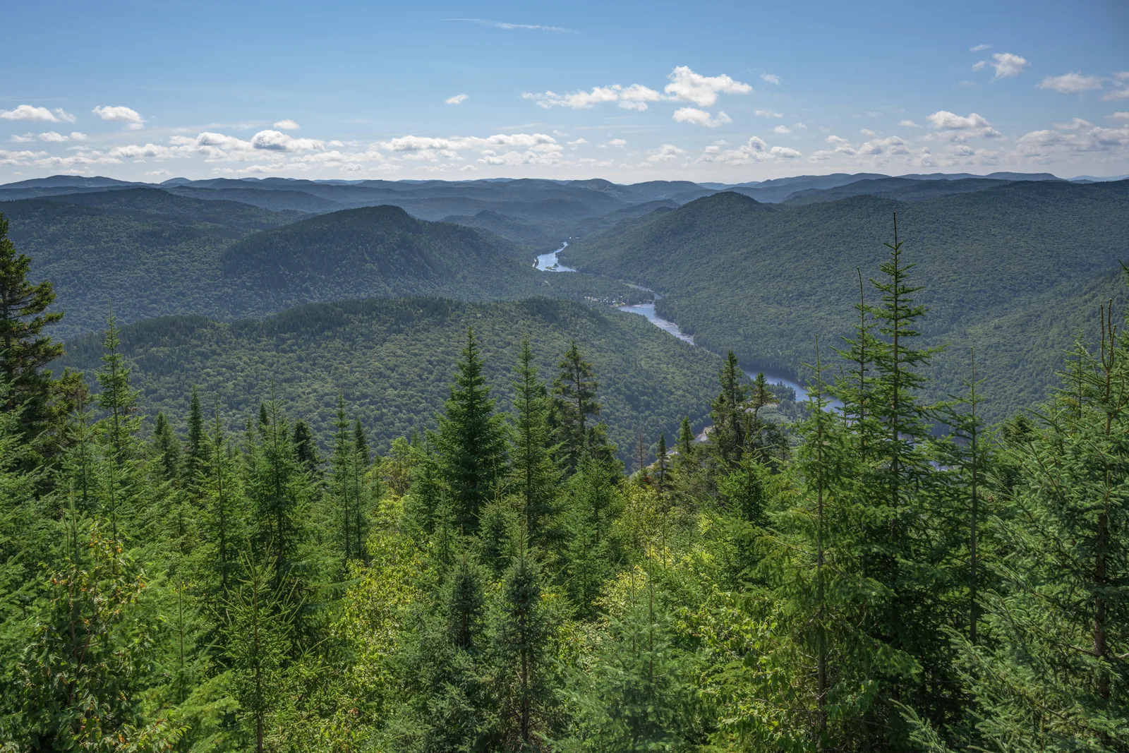 Le sentier les Loups est la randonnée emblématique du parc Jacques-Cartier : 11 km aller-retour, dénivelé 290 m, environ 4 heures avec pauses photos. Le sommet ouvre sur un panorama vertigineux de la vallée glaciaire, 600 mètres sous vos pieds, avec la rivière Jacques-Cartier sinueuse encadrée de falaises boisées. Conseil : départ 8 h pour éviter la foule estivale et profiter de la lumière douce. Apportez 2 litres d'eau par personne, casse-croûte et bâtons de marche utiles à la descente. Le réseau cellulaire est faible, téléchargez la carte SEPAQ hors-ligne avant de partir.